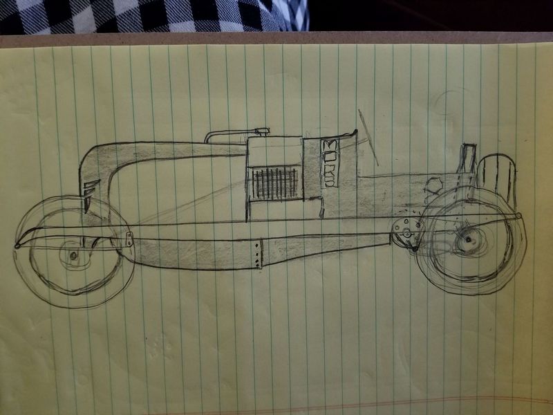 It started as the usual sketches as Kelly does... planning the car out as he went on lunch break. Sure, creating a car like this could take all kinds of routes, but in his mind... The trick here was to create the running gear AND have the outer gearing actually drive the car... then sit on the entire spinning nightmare.