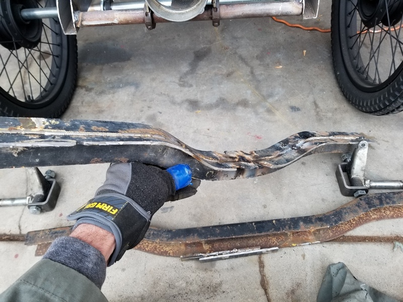 - Front axle, a spliced together version of the original. Is made of the pre-bent cross members from an old trailer. The bend in the cross members matched the mors front axle geometry perfectly.
