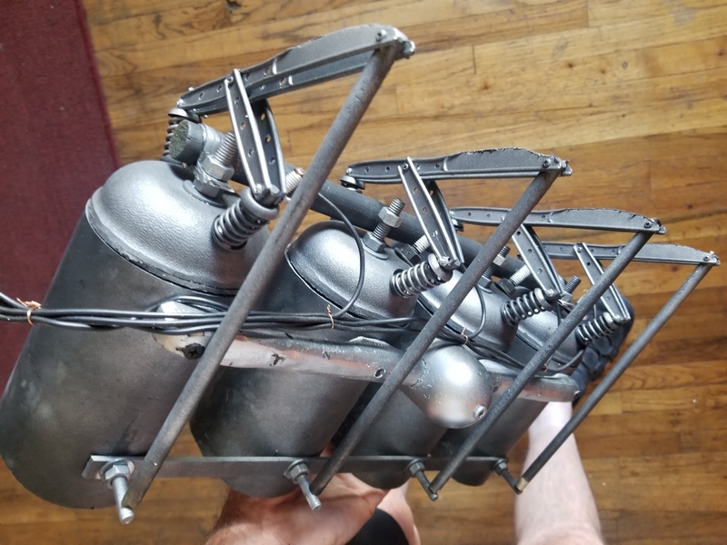 - Front light, aluminum air cleaner housing from a tractor. Mounts for the light are 2 - 1" locking collars welded to pieces of cut up go kart pedals. (Manco)
