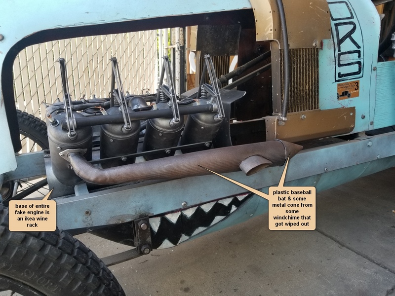 - Faux engine: Pvc pipes, plastic springs from spiral notebooks, finishing washers, the pipes are made of plastic baseball bats heated & bent, and the valve rockers.. are made of plastic knives. Yep.