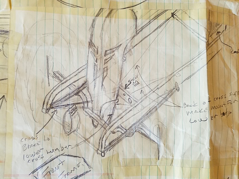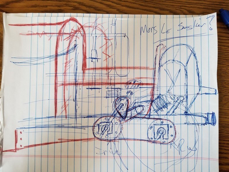 Sketch after sketch, it came alive as the bits were collected & scavenged. Once the basic bits were collected, some new, some rusty used parts... it was laid it out.