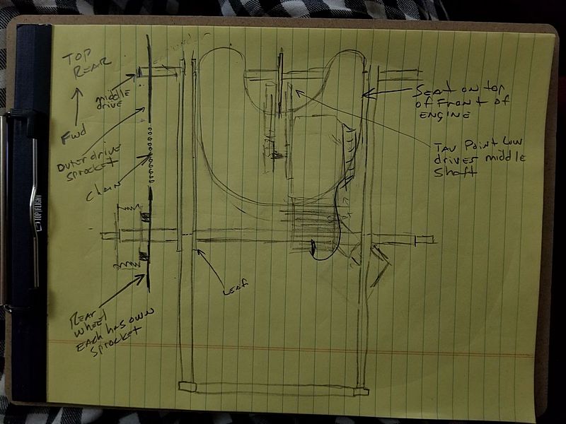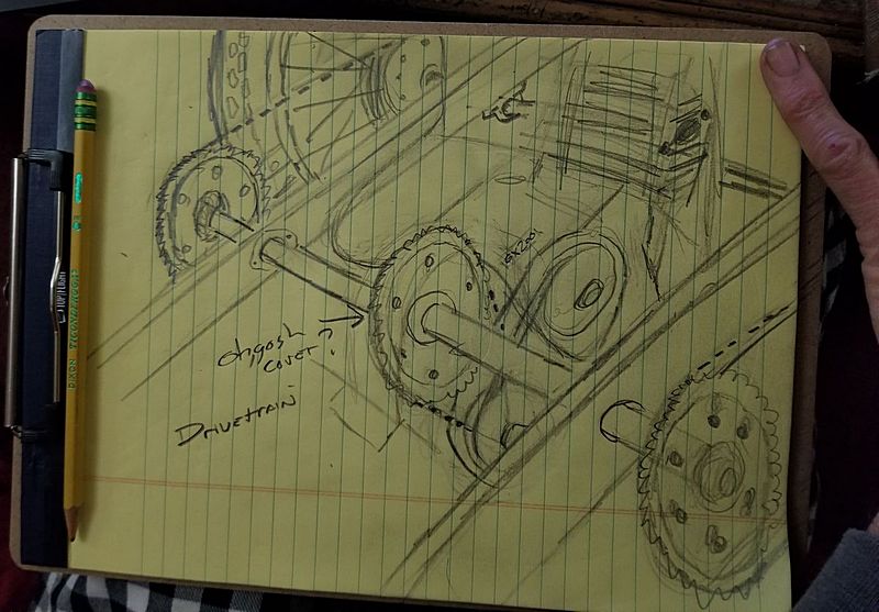 It started as the usual sketches as Kelly does... planning the car out as he went on lunch break. Sure, creating a car like this could take all kinds of routes, but in his mind... The trick here was to create the running gear AND have the outer gearing actually drive the car... then sit on the entire spinning nightmare.