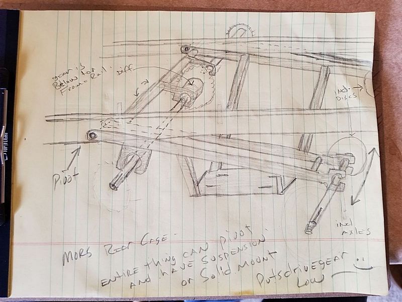 The entire rear drive system in the car is modular, 4 bolts and the entire drivetrain, engine, wheels and all, come right off the car in a u-shaped carriage of sorts. The carriage, can also pivot on only the front bolts and with the addition of 2 removable springs, has a small limited bit of rear suspension but hasn't been deployed yet.