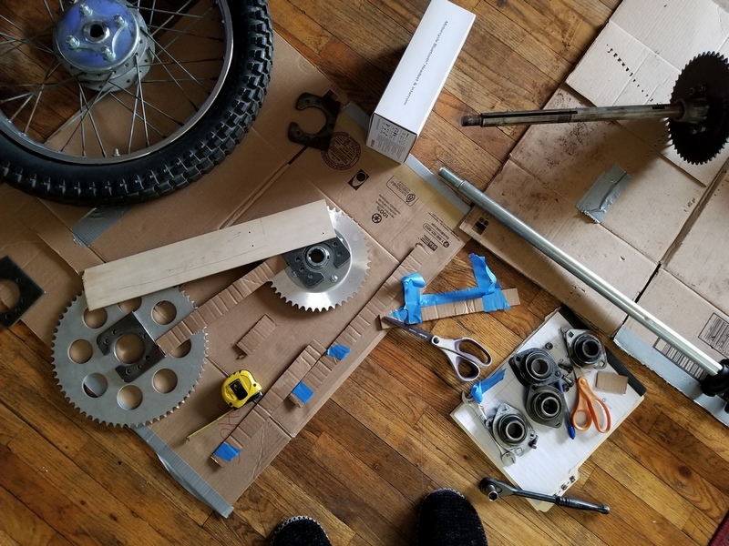 Two of the fronts were fitted with some lathed down asuza hubs, then coupled to the wheel hubs in a mish-mash sort of fashion to act as rears and the others happen to take the same bearing used on Honda Trail 90 wheels.