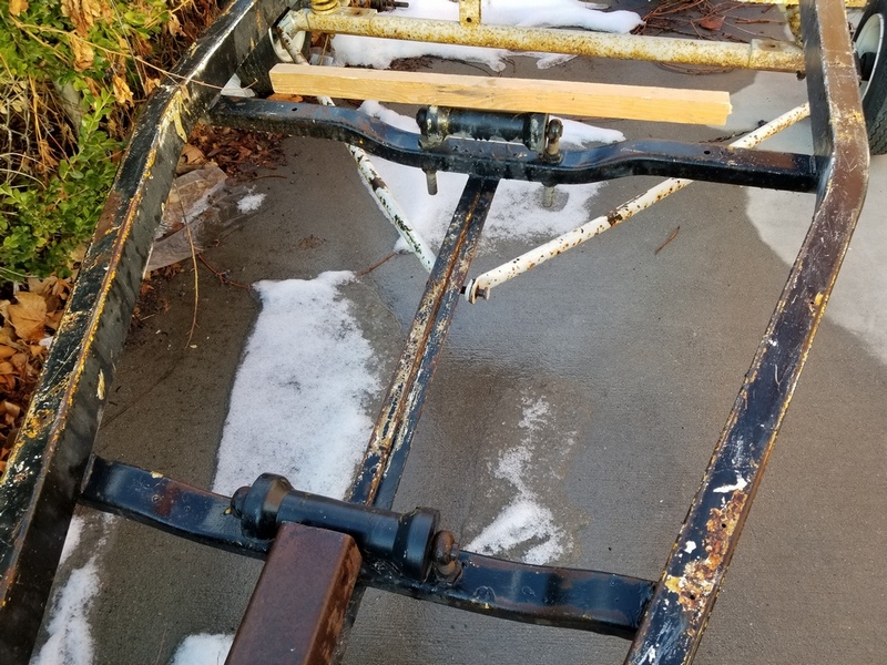 - Front axle, a spliced together version of the original. Is made of the pre-bent cross members from an old trailer. The bend in the cross members matched the mors front axle geometry perfectly.