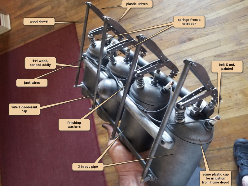 - Faux engine: Pvc pipes, plastic springs from spiral notebooks, finishing washers, the pipes are made of plastic baseball bats heated & bent, and the valve rockers.. are made of plastic knives. Yep.